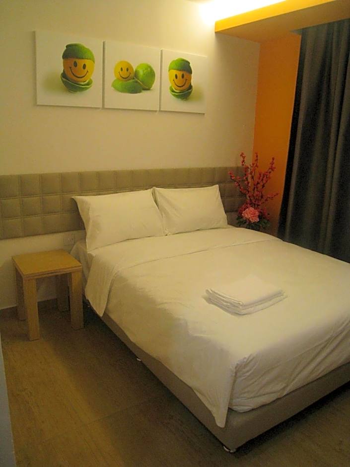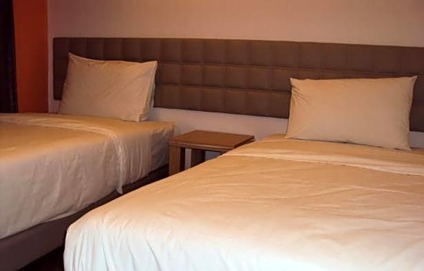 A simple room featuring 2 single beds, an attached bathroom, a desk and a flat-screen TV.